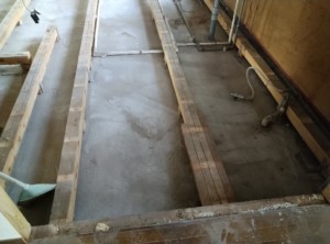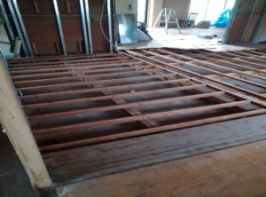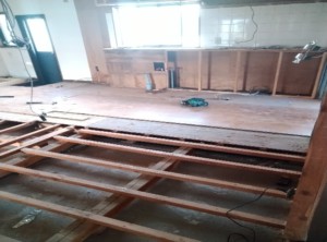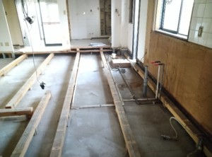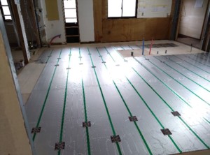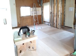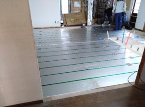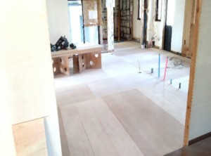 リビングとキッチンにガス式床暖房を設置するために床を撤去して下地を貼り付け床暖房シートを張り付けていきます。