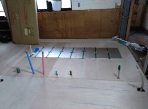 床暖房シート施工後、フローリングを貼ります。緑の部分にしか釘が使用できないため慎重にフローリングを貼っていきます。施工中何度か圧をかけて床暖房シートに傷、穴があいてないか確認しながら施工します。