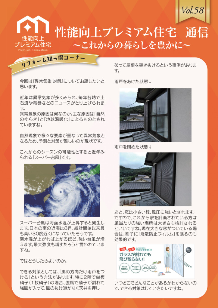 ですので、これから家を計画されている方は風当たりの強い場所は大きさも検討されるといいですね。現在大きな窓がついている場合は、硝子に「飛散防止フィルム」を張るのも効果的です。