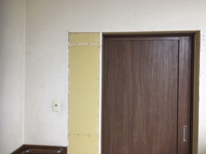内装施工中 開きの親子ドアから上吊アウトセットに交換です。