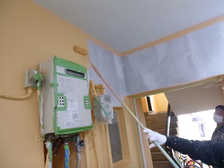 いつも工事をまかせてもらっている。オーナー様から外壁塗装工事のご依頼があり、只今塗装工事中の現場です。 タイル、外壁の浮きがあり、落下の恐れがありますので、外壁塗装前に補修します。