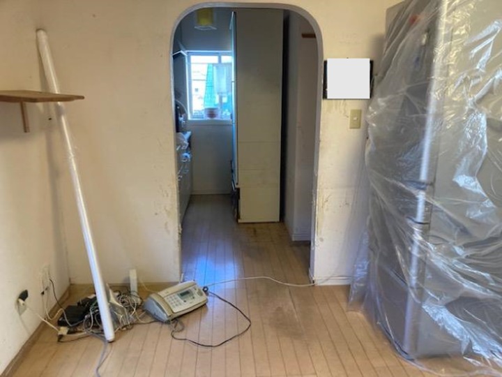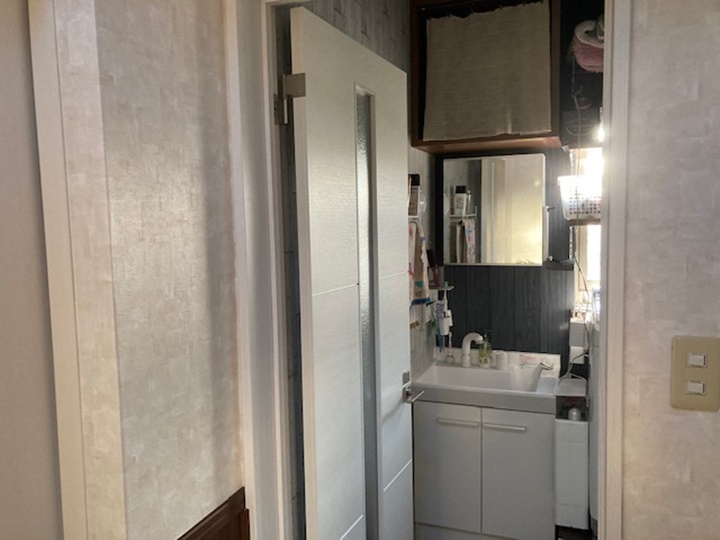 北九州市小倉南区の洗面、玄関、リビングリフォーム工事の様子です。湿気、水漏れで、床、壁が劣化しています。