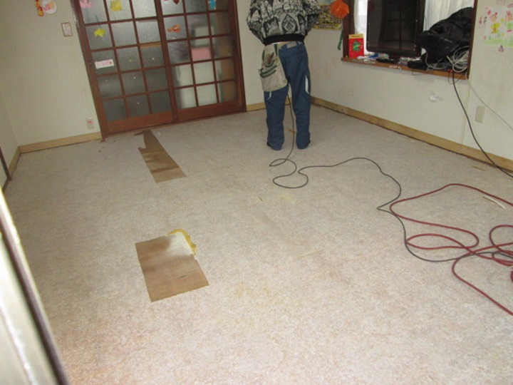 本日は床の貼り替えの施工風景を紹介します。 今回は12畳のリビングと6畳の和室をフロアタイルにしました。 和室は畳ですので、一度畳を撤去して畳分の高さを調整する為下地工事を行います。あとはフロアタイルを貼り付けていきます。