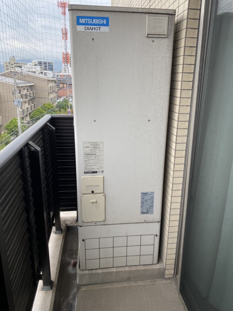 施工前 正面から見たところです。 電気温水器からエコキュートへ交換する場合、ヒートポンプの設置場所も必要となります。設置場所はお客様に確認して設置していきます。