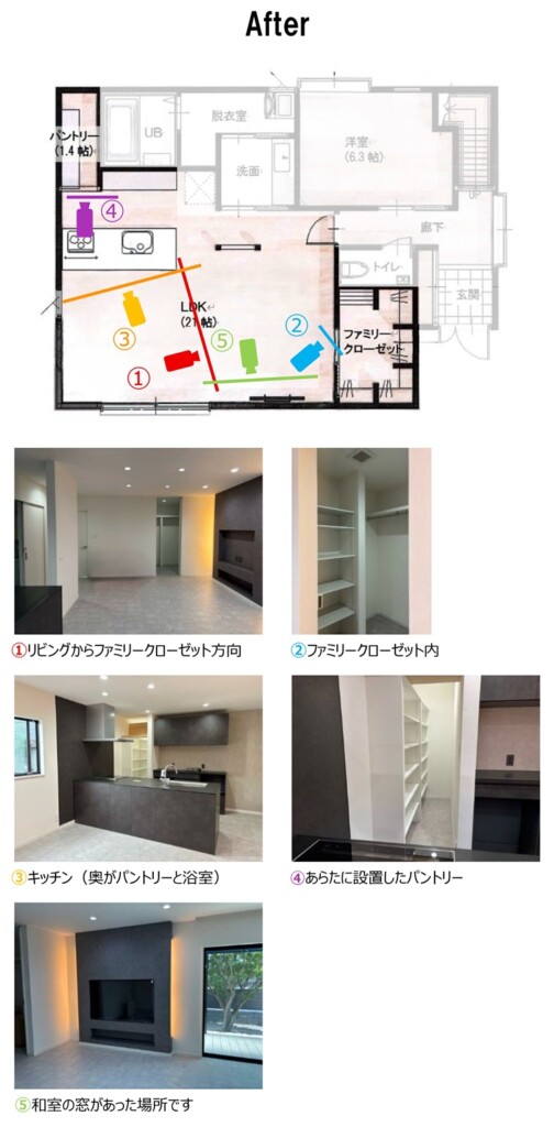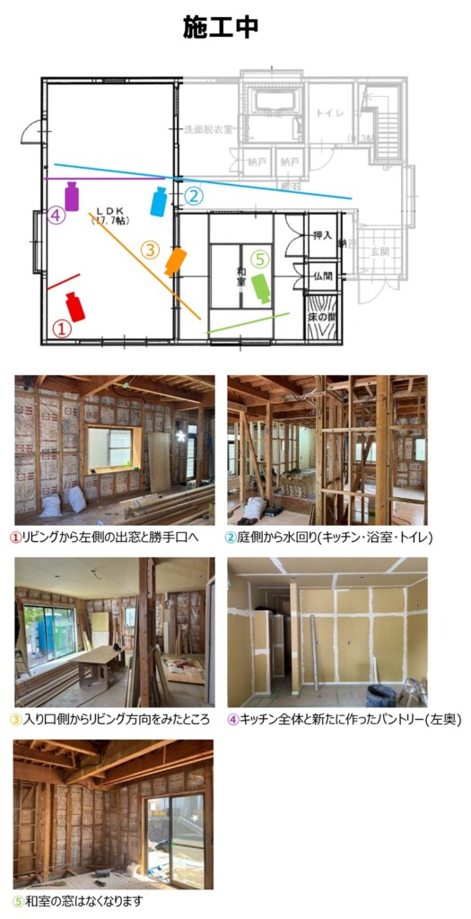 リビング、キッチン、和室があった場所の間仕切り壁を解体して、キッチン、リビング、ファミリークローゼット、浴室にしました。(浴室は別途ご紹介しています)