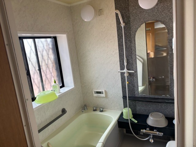 浴室のユニットバスは「グランスパ」です。こちらも人気のシリーズです。洗面化粧台同様、壁部分がホーローなのでお手入れがしやすいだけでなくマグネットがどこにでも付くので、浮かせる収納・動く収納が可能です。