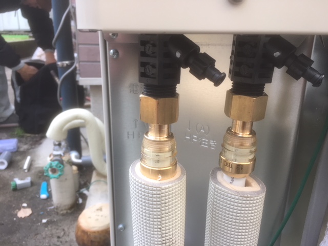 エコキュートヒートポンプ、タンクに接続する金具も専用の高価な継手を使用します,10年以上使用するためしっかりとした工事、部材を使用します。