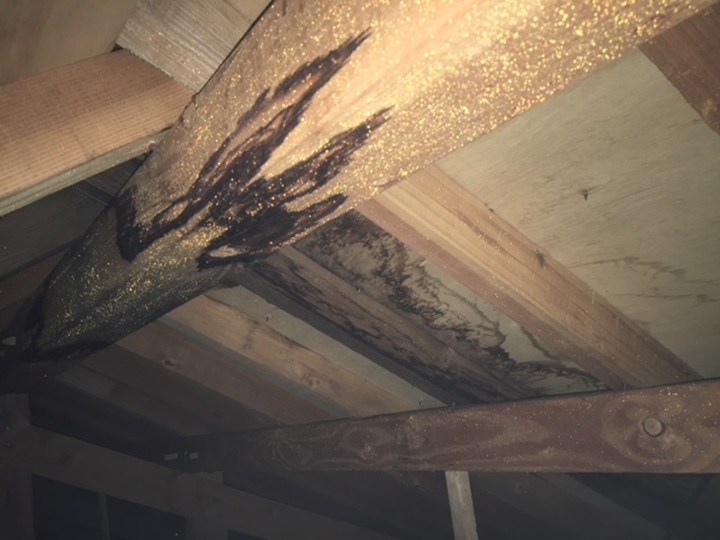 屋根裏から見ると雨漏りしているのがみうけられます。