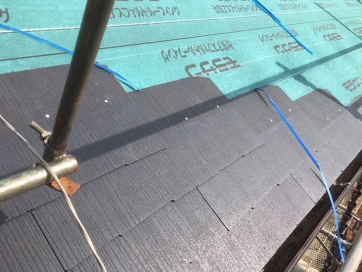 既存コロニアルを剥いで雨漏り箇所を補修してルーフェィングを敷いていきます。