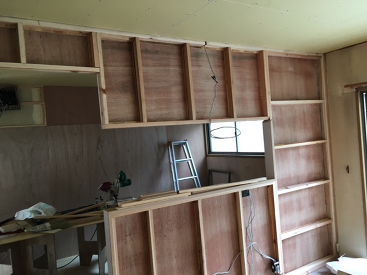 北九州市門司区 K様邸全面リフォームの水周り工事の様子です。 L型キッチンをI型に変更,換気扇等の位置も変更いたします。