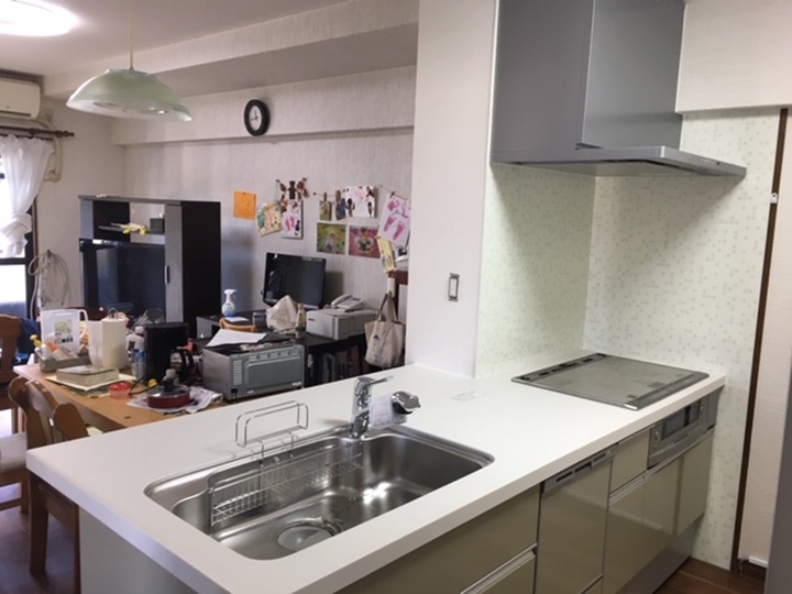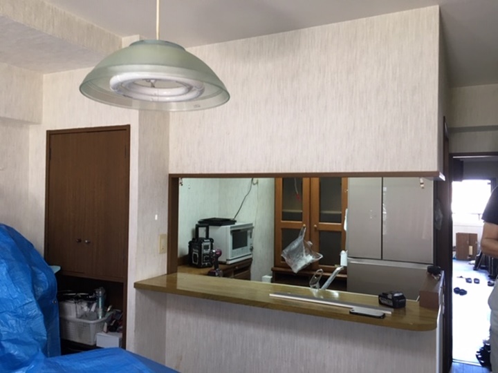 既存のキッチンの吊戸、カウンターを壊してオープン型のLIXILセンター型キッチンシエラを設置しました。